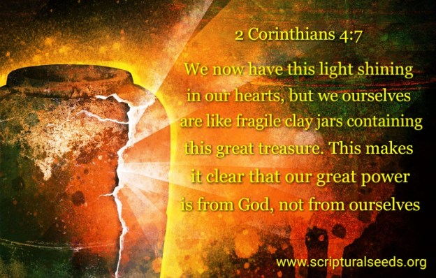 “We now have this light shining in our hearts, but we ourselves are like fragile clay jars containing this great treasure. This makes it clear that our great power is from God, not from ourselves.” (2 Corinthians 4:7)